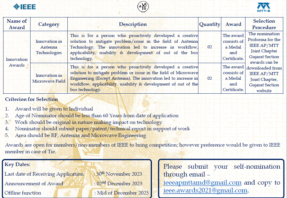 The list of Awards for year 2023 together with their description, are outlined in this brochure. The IEEE AP/MTT Joint Chapter Gujarat Section invites nominations for these awards in the prescribed enclosed proforma for consideration.