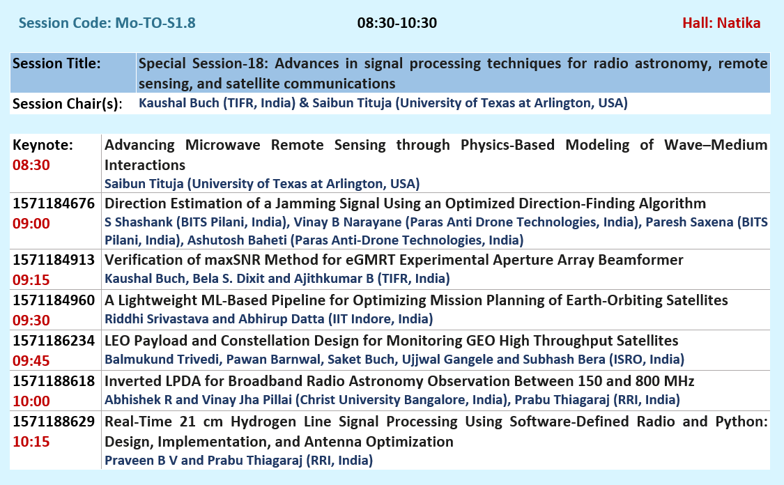 Special Session-18: Advances in signal processing techniques for radio astronomy, remote sensing, and satellite communications
