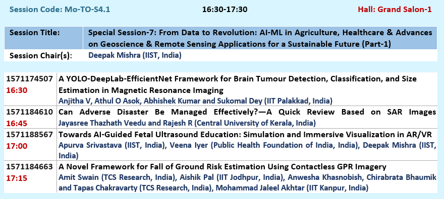 Special Session-7: From Data to Revolution: AI-ML in Agriculture, Healthcare & Advances on Geoscience & Remote Sensing Applications for a Sustainable Future (Part-1)