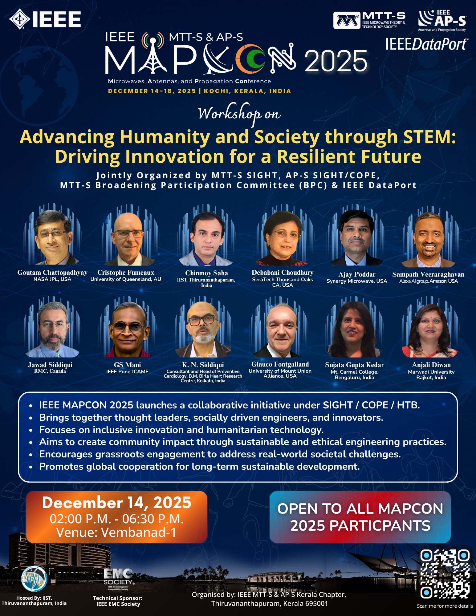This workshop is jointly organised by MTT-S SIGHT, AP-S SIGHT/COPE, MTT-S Broadening Participation Committee (BPC), and IEEE DataPort, in collaboration with the IEEE MTT-S & AP-S Kerala Chapter and IIST Thiruvananthapuram. Technical sponsorship is provided by the IEEE EMC Society.